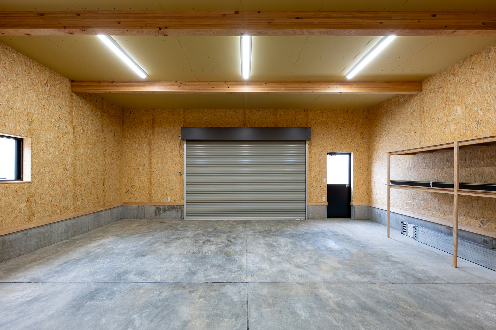 工具やパーツを収納できる造作棚も設け、整備やカスタムを楽しめる空間に仕上げています。