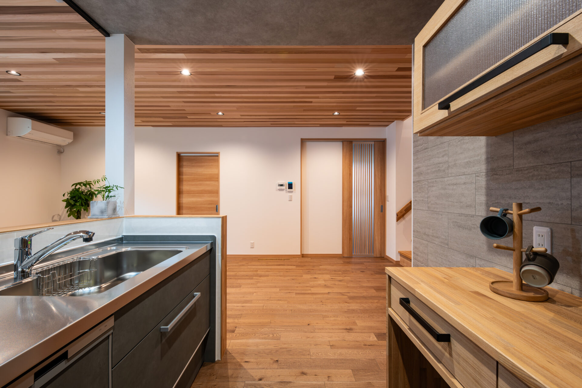 木のやさしい質感と、グレーのタイルが空間をほどよく引き締めます。